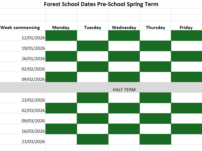 Here you can find the dates for our forest school sessions. As a registered forest school provider we have to attend forest school at least 3 times a week. We rotate our sessions so that all children can attend at least once a week, depending on their scheduled days.
